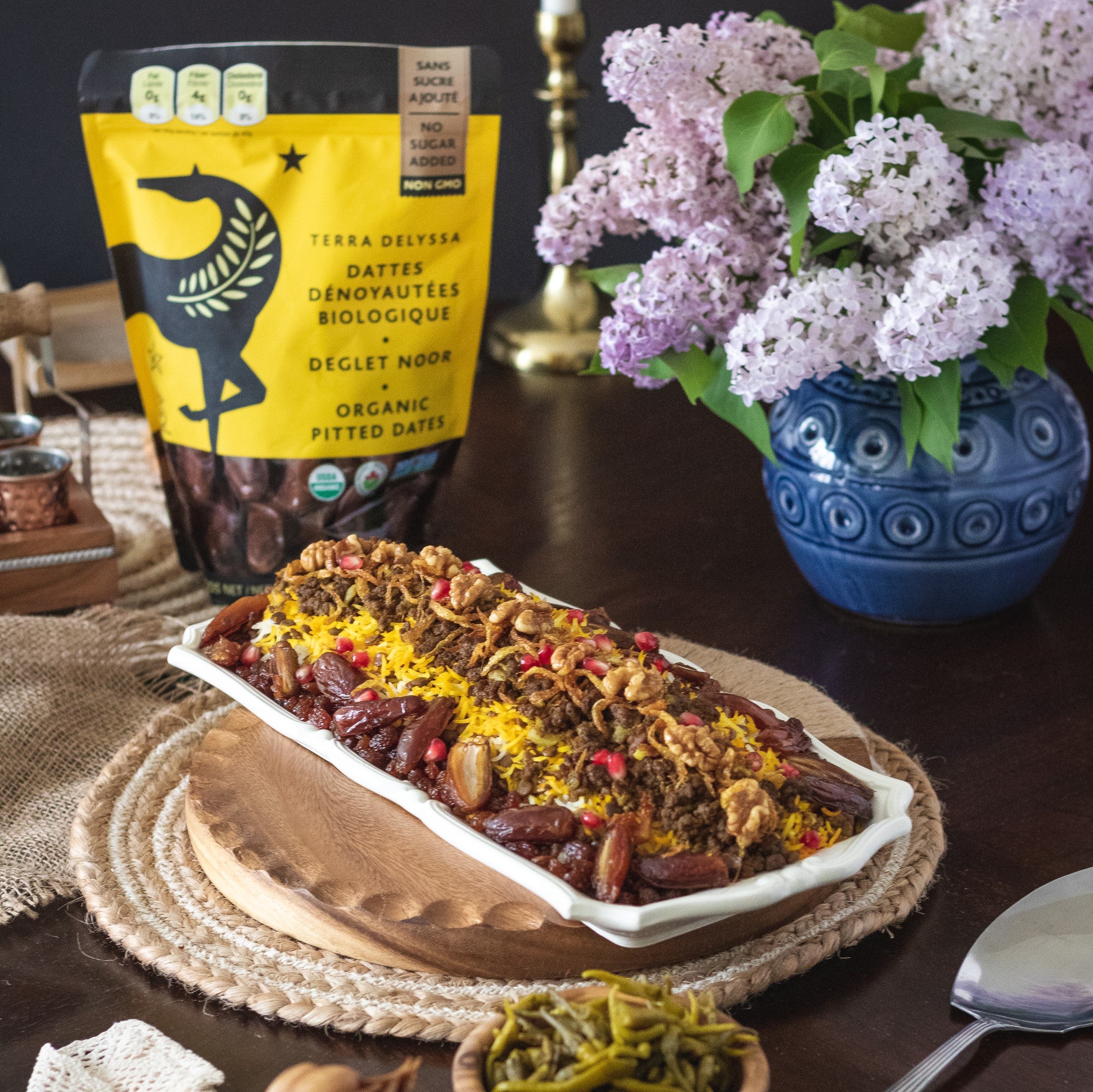 - Place the cooked rice mixture in a serving dish, top it with saffron rice, meat mixture, dates, walnuts and raisins. Sprinkle some onion chips and pomegranate arils.