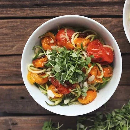 Heat 2 tablespoons of Terra Delyssa Organic Garlic Infused Olive Oil in a large pan over medium-high heat and add the minced garlic. Heat for 1 minute, until fragrant, then add the zucchini noodles. Cook for 2-3 minutes, until the zucchini noodles begin to soften, then add the tomatoes and all of their juices, the fresh lemon juice and zest and salt and pepper, to taste. You can also add a pinch or two of red pepper flakes if you desire. Toss to combine.